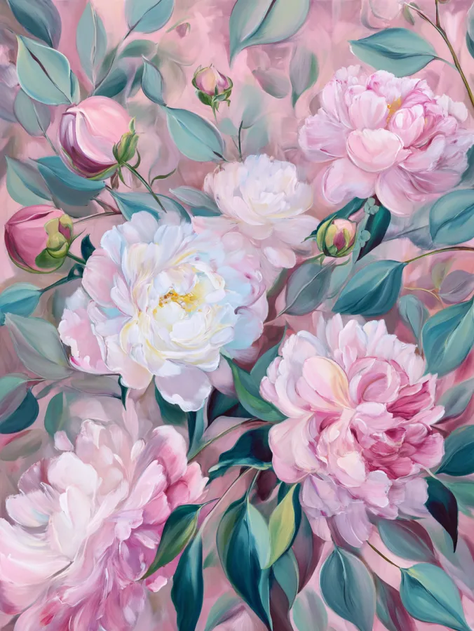 This acrylic painting captures a dreamy cluster of blooming peonies surrounded by elegant teal green leaves. Large layered petals swirl outward in soft shades of blush pink, creamy white, and pale rose. Gentle highlights bring life to the petals while deeper shadows tuck into the folds for subtle depth. The leaves weave through the flowers in graceful curves that guide the eye across the canvas. The background glows with hazy pink tones that melt softly into the blooms, giving the whole scene a romantic garden atmosphere. Loose yet controlled brush strokes create delicate textures that feel airy and organic.