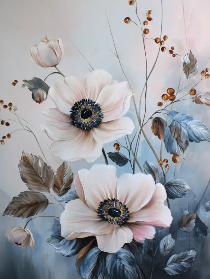 This acrylic painting features graceful ivory anemone flowers blooming gently across a calm airy background. The petals are painted in creamy white tones with hints of blush and warm beige that give them a soft velvety look. Each flower surrounds a dark textured center that adds depth and contrast to the delicate petals. Silvery blue leaves and slender stems flow around the blossoms which creates a balanced and elegant composition. Small golden berries are scattered through the arrangement and add warm accents. The background blends pale blue, soft gray, and light misty tones which keeps the entire scene calm and refined.