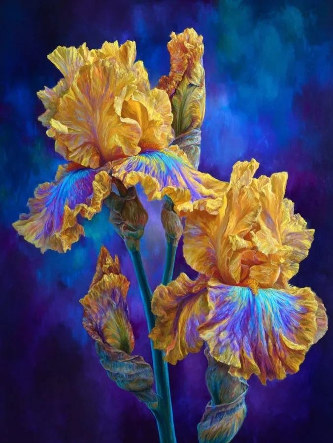 I always think iris flowers are one of the most exciting florals to paint because the petals have so much movement and personality. The ruffled edges invite playful brush strokes and bold color blending. When I paint something like this I get to experiment with bright highlights and dramatic contrast which keeps the process fun the whole time. If you enjoy vibrant florals that feel a little bold and artistic this kind of painting can turn an ordinary painting session into a colorful creative adventure.