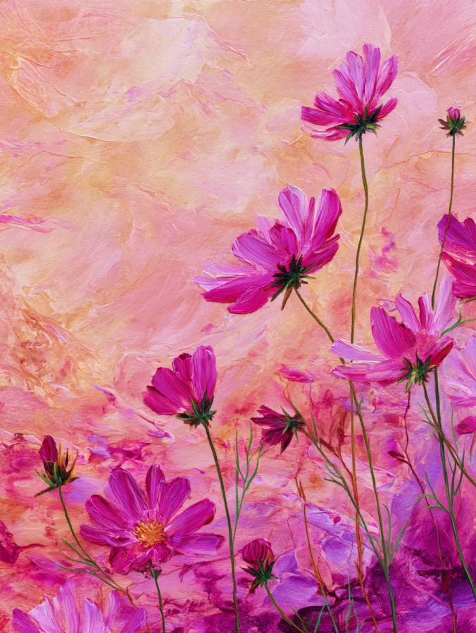 I love painting cosmos flowers because they feel playful and carefree on the canvas. The thin stems and simple petals allow me to paint loosely without worrying about tiny details. It is also fun to experiment with bright pink tones against a warm glowing background. When I work on a painting like this it feels like capturing a peaceful summer evening in a field of flowers. That relaxed mood makes the whole painting process feel calm and joyful.