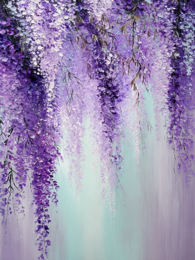 This acrylic painting shows long flowing clusters of wisteria blossoms hanging gracefully from delicate branches. The flowers appear in layers of soft violet, lilac, and pale lavender which blend beautifully together. Each cluster is formed with small textured strokes that create a fluffy cascading effect as the blooms trail downward. Thin branches peek through the petals while subtle leaves add gentle movement near the top of the canvas. The background fades softly from misty turquoise into pale lavender which keeps the scene light and dreamy while allowing the flowers to stand out.