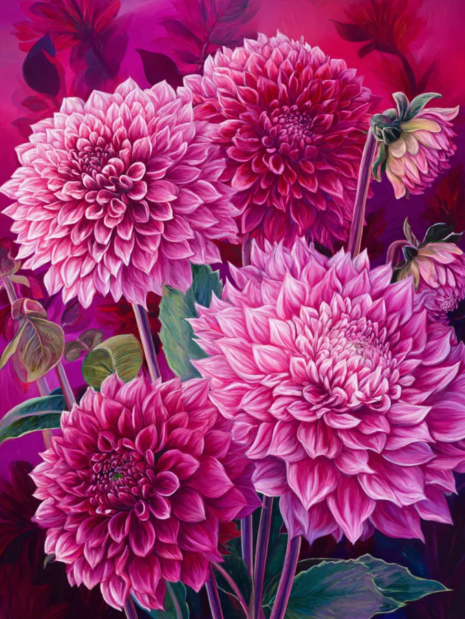 This acrylic painting showcases a cluster of lush dahlia blooms filling the canvas with rich layers of pink petals. Each flower bursts outward in tightly packed petals that range from soft blush to deep magenta. The layered shapes create beautiful texture and depth which makes the blooms feel full and dimensional. Smooth green leaves peek between the flowers while slender stems rise through the composition. Behind the blossoms, a glowing backdrop of hot pink and crimson tones intensifies the color of the petals and gives the painting a dramatic floral presence.
