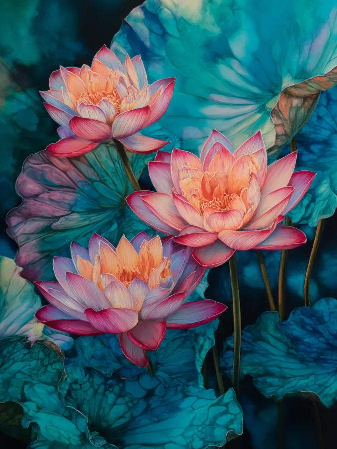 I love painting lotus flowers because they feel peaceful and a little magical at the same time. The petals are layered but still simple enough to paint slowly without feeling overwhelmed. It is also really fun to contrast those soft glowing petals against deep moody water colors. When I work on a lotus painting like this it almost feels meditative. The calm shapes and gentle color blending make the whole process relaxing and very satisfying.