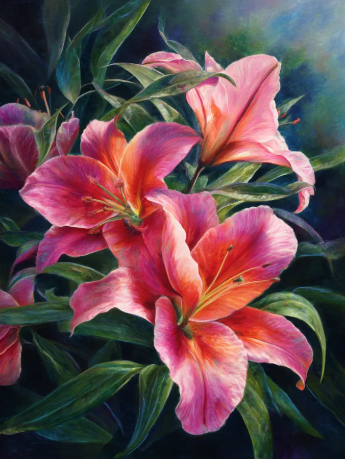 This acrylic painting features a cluster of elegant pink lilies opening wide among rich green foliage. The petals glow with soft gradients of coral, rose pink, and warm peach that gently fade toward lighter edges. Each flower stretches outward with smooth curved petals and delicate stamens reaching from the center. Deep green leaves surround the blooms and create a lush layered composition that frames the flowers beautifully. The background blends soft teal and midnight blue tones which gives the painting a slightly moody garden atmosphere while making the lilies shine with vibrant color.
