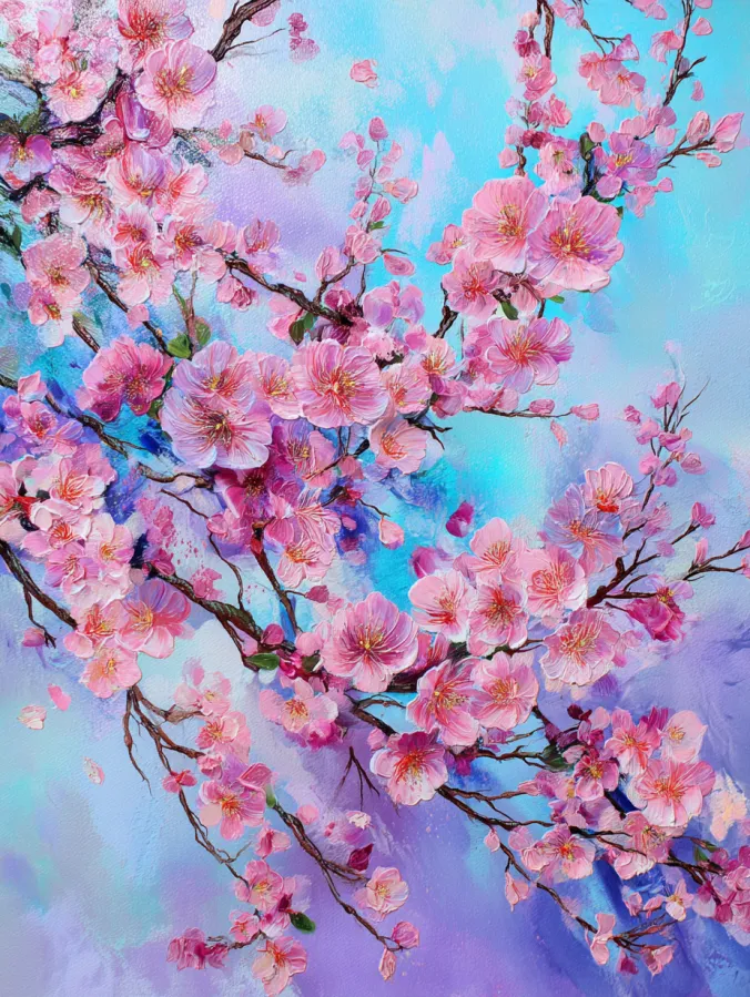 I always find cherry blossom paintings incredibly soothing to work on. The flowers are small and playful so I can paint them freely without worrying about perfection. Building up little clusters of petals feels almost like decorating a cake with frosting. The soft sky colors make blending really fun too. After a few minutes the canvas starts looking like a peaceful spring garden which is honestly the best mood boost during a painting session.