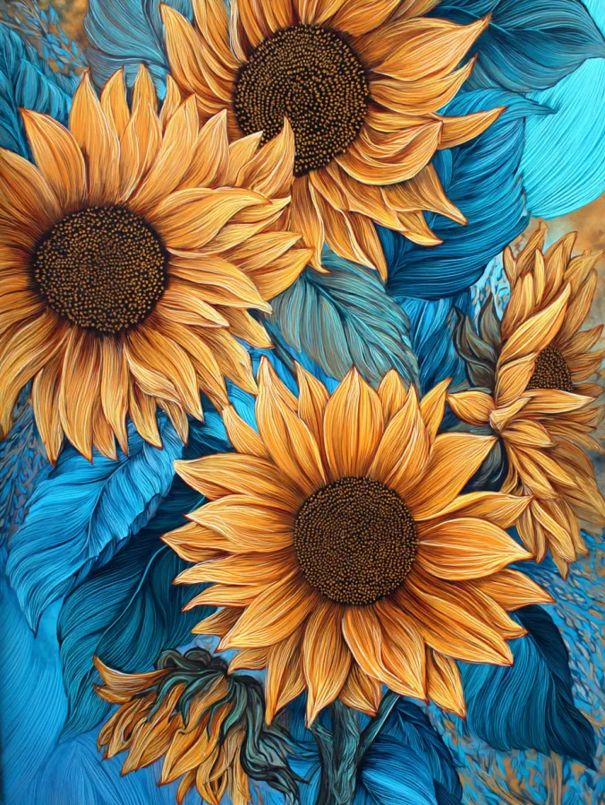 This acrylic painting features a lively group of sunflowers blooming across the canvas with rich golden petals radiating around deep textured centers. Each flower is painted with layered strokes that give the petals a slightly sculpted look. The dark brown centers are packed with tiny dotted details that add beautiful contrast. Behind the flowers, sweeping blue leaves fill the background in flowing shapes and textured lines. The cool blue tones make the warm sunflower petals glow even brighter and create a striking color balance across the whole composition.