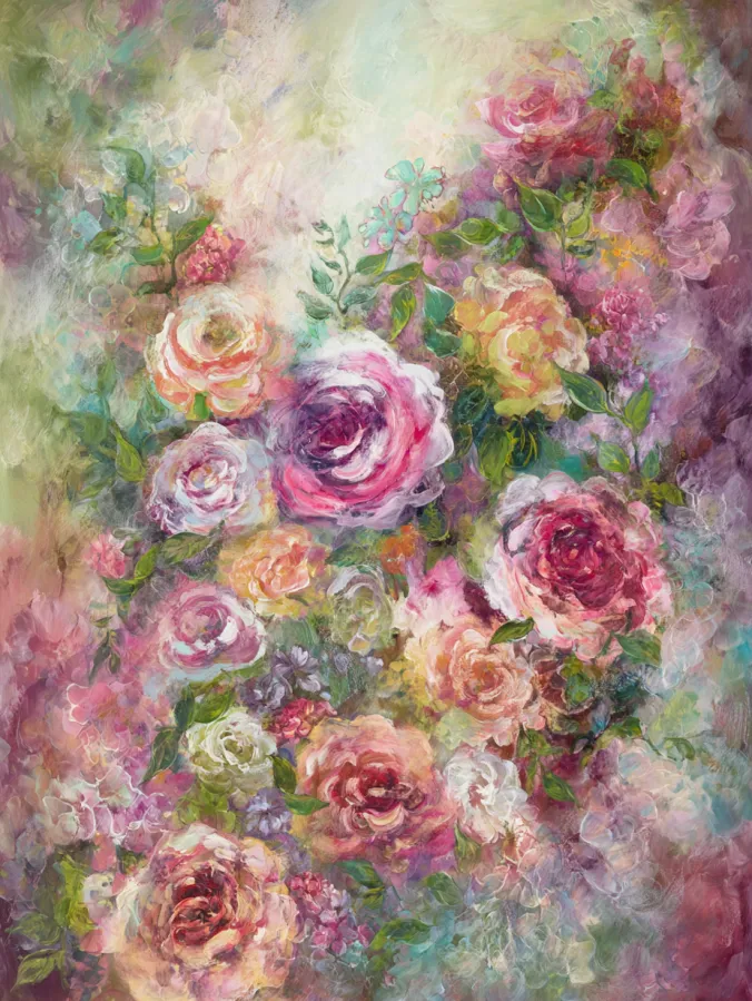 This acrylic painting shows a lush garden bouquet filled with blooming roses and delicate blossoms layered across the canvas. The flowers appear in soft shades of blush pink, creamy peach, warm rose, and pale yellow. Each bloom is painted with loose swirling brush strokes that give the petals a gentle impressionist look. Small green leaves and airy floral sprigs weave between the roses which adds movement and natural flow to the arrangement. The background glows with misty blends of pastel green, lavender, and soft coral tones which creates a dreamy garden atmosphere around the flowers.