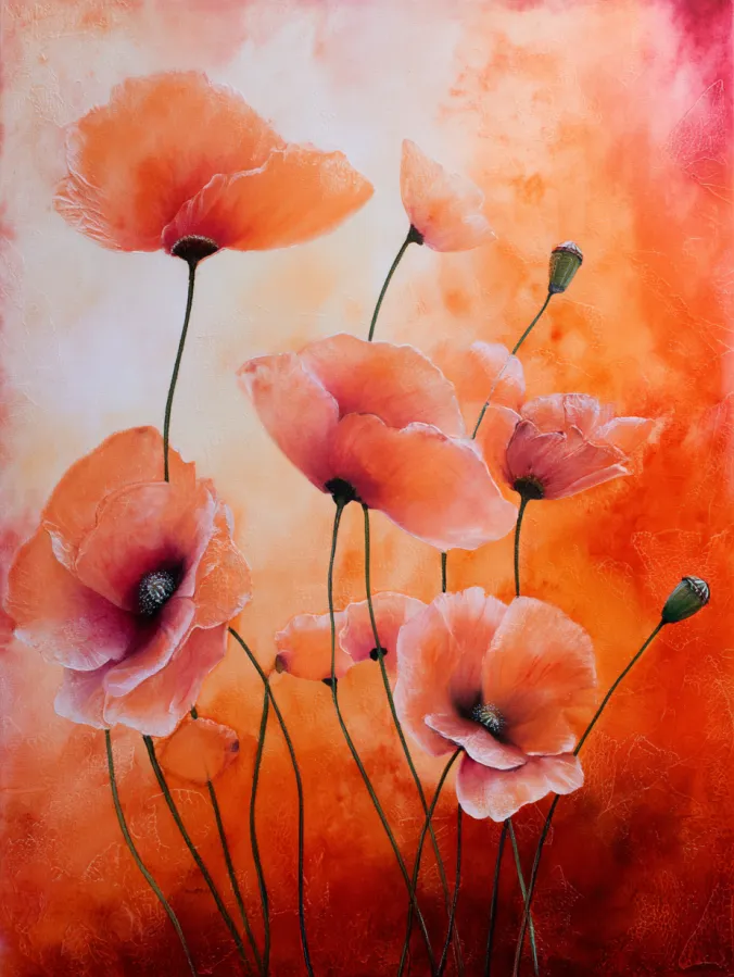 This acrylic painting shows a group of delicate poppy flowers rising on thin graceful stems against a glowing sunset background. The petals appear in soft coral and peach tones with gentle translucent edges that give them a light airy feel. Each flower opens loosely with a darker center that adds contrast and depth. Slender stems curve upward in elegant lines which creates a sense of movement across the canvas. Behind the flowers, warm layers of orange, apricot, and pale cream blend together in soft textured strokes that feel like a dreamy evening sky.
