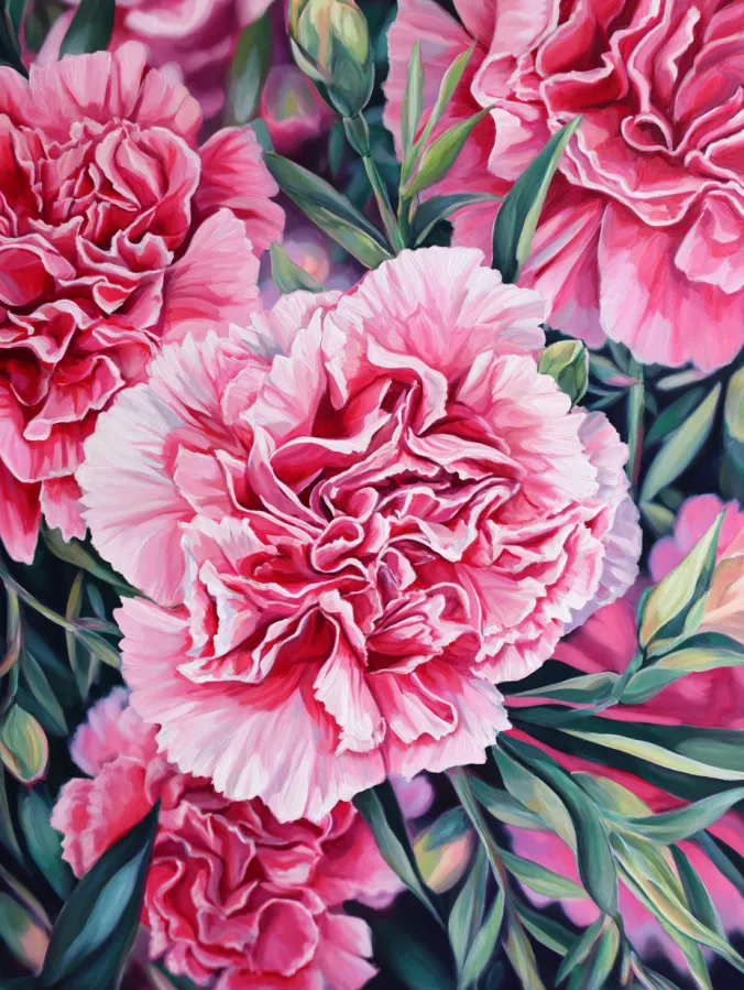 This acrylic painting highlights a group of blooming carnations filled with beautifully ruffled petals. The flowers are painted in rich shades of rose pink, blush, and soft coral with delicate white highlights along the petal edges. Each bloom unfolds in layers of wavy folds that create a full textured look. Deep green leaves and slender stems weave between the flowers which helps frame the blossoms and add natural depth to the composition. The background remains softly blended in darker floral tones which allows the bright carnations to stand out as the main focus.