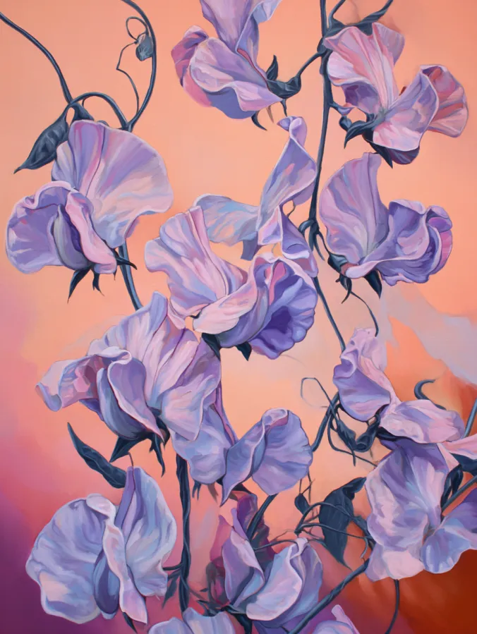 This acrylic painting features a graceful cluster of sweet pea flowers winding upward along delicate twisting vines. The blossoms are painted in soft shades of lavender, lilac, and pale violet with gentle highlights that bring out the flowing curves of each petal. Slender dark stems curl naturally through the composition which adds movement and elegance to the scene. Behind the flowers, the background glows with warm sunset tones of peach, coral, and soft apricot. The contrast between the cool purple petals and the warm glowing sky gives the painting a romantic and airy atmosphere.
