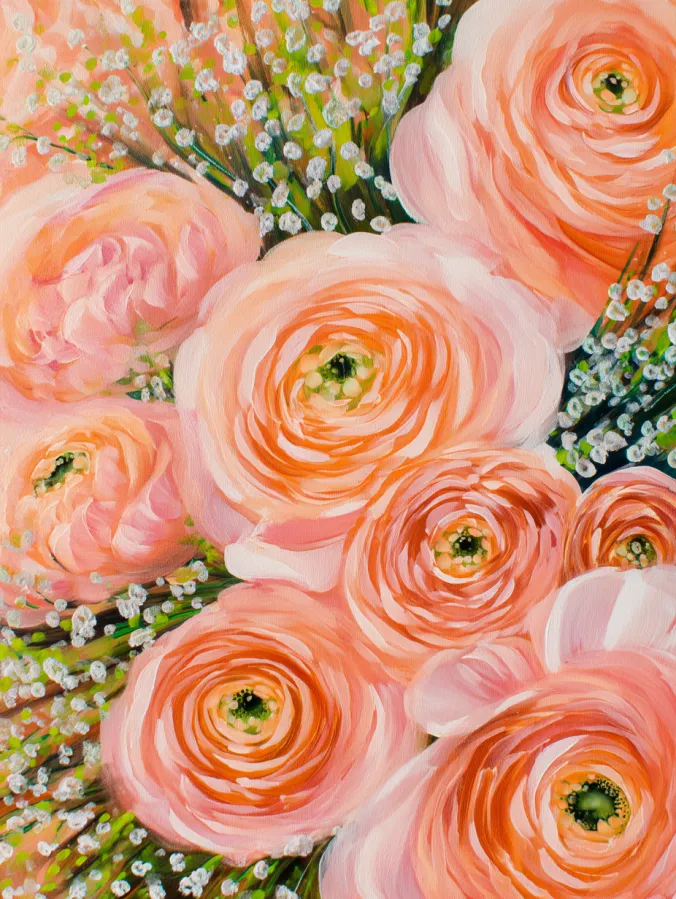 This acrylic painting showcases a lush bouquet of ranunculus flowers painted in soft peach and coral tones. The blooms are arranged close together so the canvas feels full and lively. Each flower forms a beautiful spiral of layered petals that gently fold inward toward a small green center. Soft blush highlights and warmer orange strokes give the petals a glowing softness. Tiny white baby’s breath flowers scatter through the bouquet which adds a light airy contrast against the larger blooms. Fresh green stems and leaves weave through the composition while subtle brush textures give the whole painting a handmade charm.