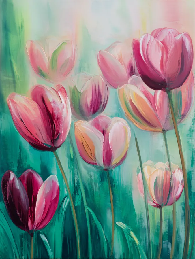 I always enjoy painting tulips because the shapes are simple but still look elegant on the canvas. A few curved strokes can create a beautiful flower which makes the whole process feel relaxing instead of stressful. The tall stems also make the composition feel balanced and graceful. When I paint something like this I get to play with color blending in the background while slowly building each flower. It feels calm, creative, and just a little bit magical when the tulips start coming to life.