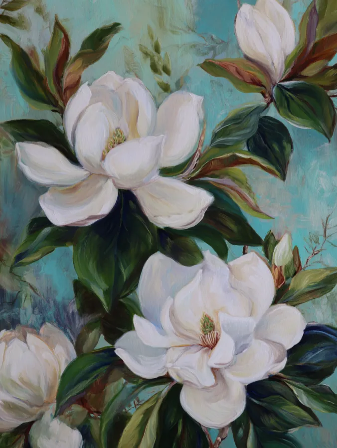 This acrylic painting highlights a cluster of elegant white magnolia flowers arranged across the canvas with rich green leaves curling around each bloom. The petals are painted in creamy ivory tones with soft hints of warm beige and pale yellow near the centers. Each flower opens wide with smooth curved petals that feel thick and velvety. Deep green leaves add contrast with layered brush strokes that show subtle shades of olive and forest green. The background glows in a calm turquoise wash that softly fades behind the flowers. Gentle texture in the brush work gives the whole piece a timeless botanical painting feel.