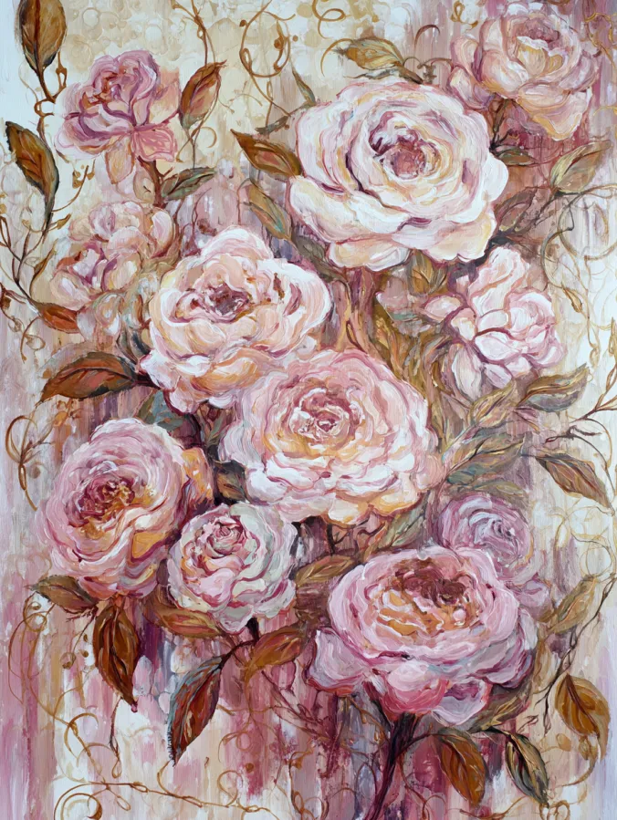I always find paintings like this incredibly relaxing because the roses can be built slowly one layer at a time. Each petal adds a little more depth which feels very satisfying as the flowers start to form. The playful golden vines are also a fun detail because they allow a bit of loose creative movement without worrying about perfection. If you enjoy romantic floral styles with a slightly vintage mood this kind of painting feels cozy, creative, and wonderfully calming to work on.
