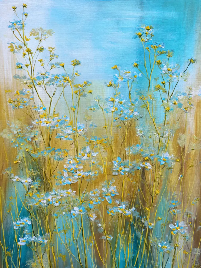 This acrylic painting shows a field of delicate wildflowers reaching upward on thin golden stems. Small sky blue blossoms scatter across the canvas like tiny stars in a meadow. The flowers are painted with light loose strokes that give them a soft airy feeling. Warm golden grasses rise behind them which adds a gentle sunlit glow. The background blends dreamy tones of turquoise, pale aqua, and sandy beige which creates the impression of a bright open landscape. The vertical stems lead the eye upward and give the whole composition a peaceful natural rhythm.