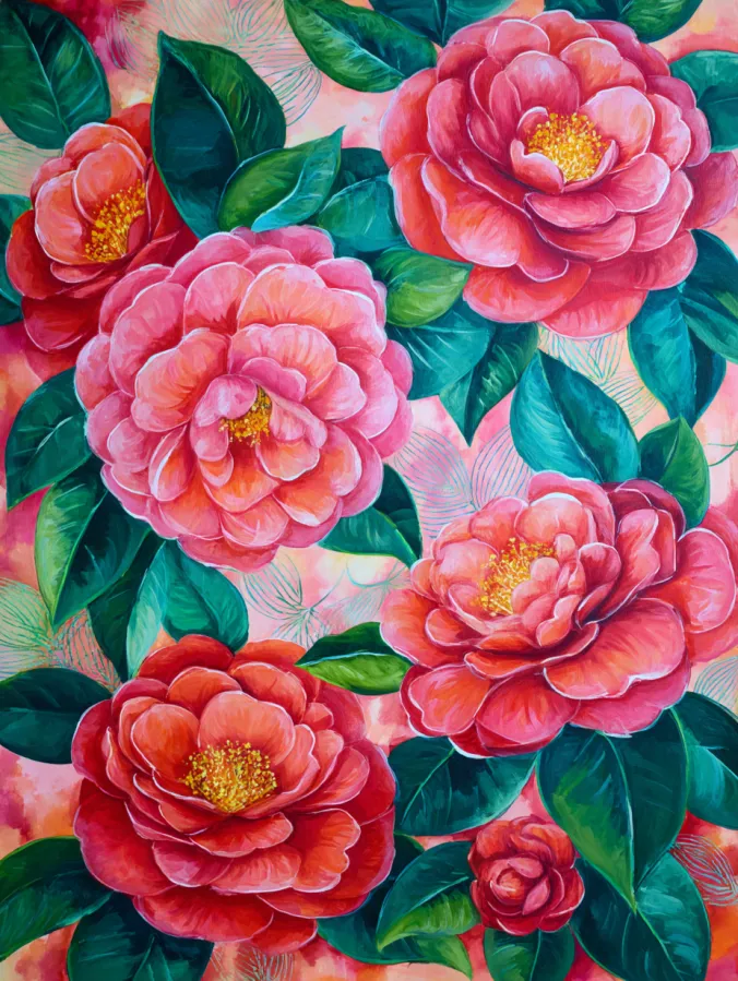 This acrylic painting features bold camellia flowers blooming across the canvas in rich coral and rose tones. The petals are layered in rounded shapes that create a soft spiral toward the glowing golden centers. Each bloom stands out against deep emerald green leaves that are painted with smooth curved brush strokes and subtle highlights. The background glows in warm peach and blush shades with faint decorative patterns that add a soft artistic texture behind the flowers. The composition feels full and balanced with large blossoms placed across the canvas like a lively floral tapestry.