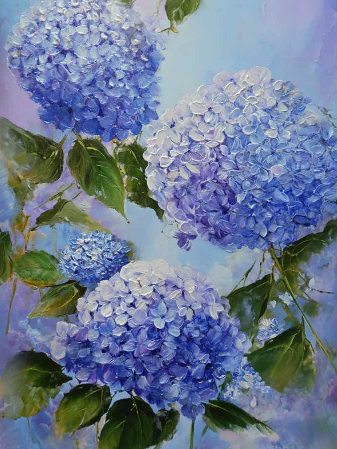 This acrylic painting features large hydrangea blooms made up of dozens of tiny petals gathered into round clusters. The flowers shift through gentle shades of powder blue, lavender, and pale periwinkle which creates beautiful depth across each bloom. Thick textured brush strokes give the petals a slightly raised look that makes the clusters feel lush and full. Deep green leaves peek out between the flowers with glossy highlights that add contrast. Behind the blooms, the background blends soft sky blue and misty lilac tones which gives the painting a calm airy garden atmosphere.