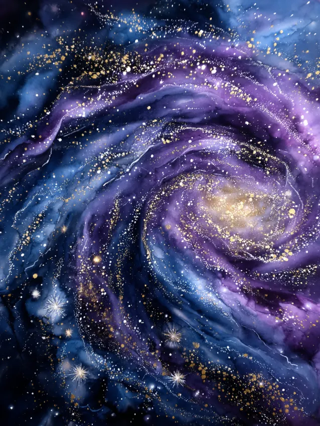 This bold metallic watercolor painting captures a spiral galaxy swirling in deep indigo, violet, and midnight blue. Tiny metallic gold speckles scatter across the stars, creating a luminous effect that contrasts beautifully against the dark cosmic background. The circular motion draws the eye inward toward the glowing center.