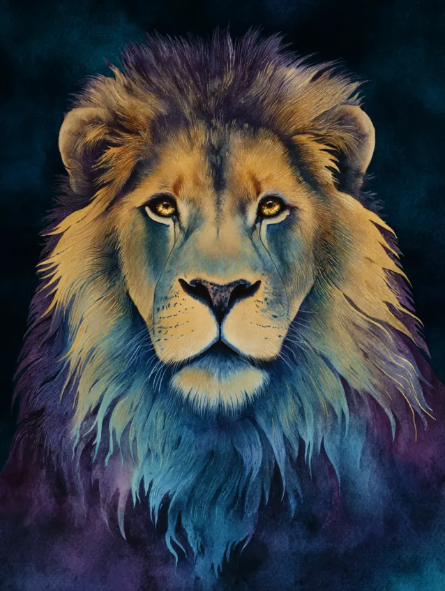 This metallic watercolor painting features a powerful lion gazing forward with calm intensity, its mane flowing in layered strokes of gold, amber, deep indigo, and violet. Subtle metallic highlights catch along the strands of fur, giving the mane a luminous glow against the dark blended background. The composition is centered and bold, with rich shadows around the edges that frame the face and draw all attention to those steady, golden eyes.