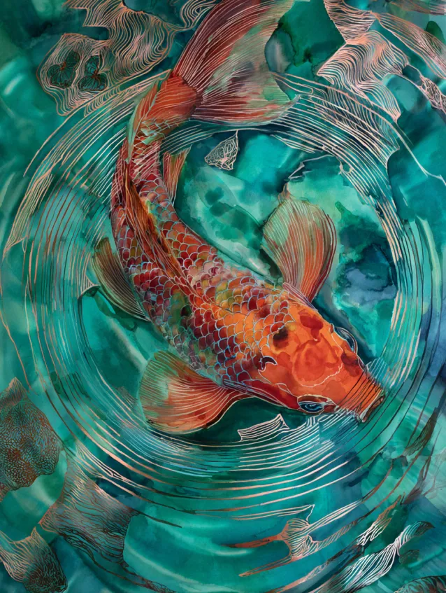 There is something incredibly soothing about painting water in soft, layered curves. I love blending cool greens and blues, then adding a hint of metallic sparkle to make the fish pop. It feels peaceful but still eye catching enough to stand out on any wall.