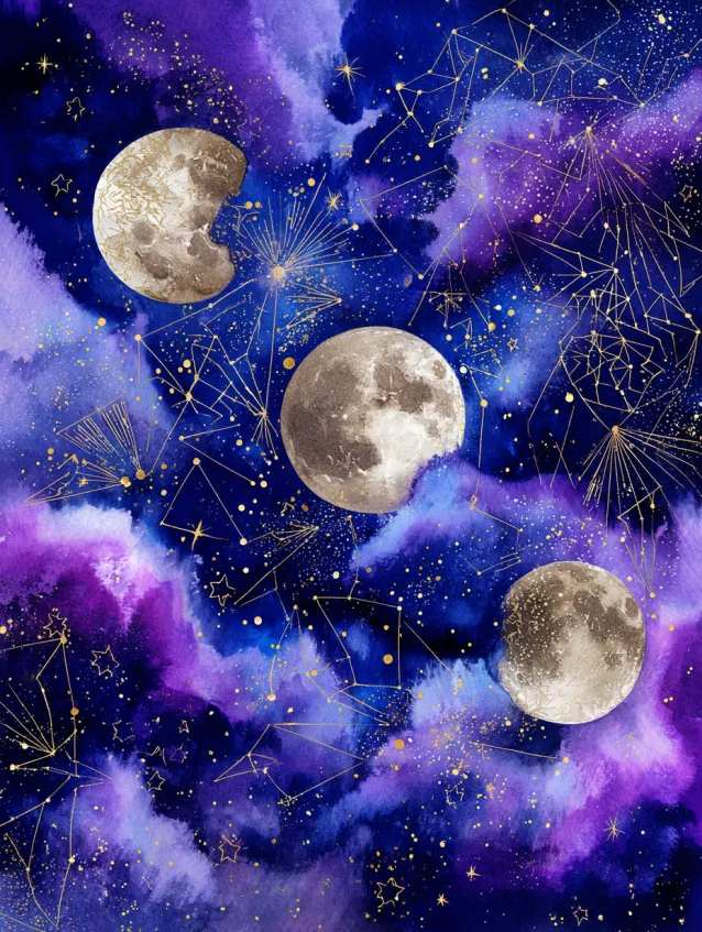 This metallic watercolor painting showcases three luminous moon phases floating across a deep violet and cobalt sky. Fine metallic gold lines connect constellations in delicate patterns, while scattered star speckles shimmer against swirling galaxy clouds. The layout feels celestial and expansive, with glowing moons acting as soft focal points across the composition.