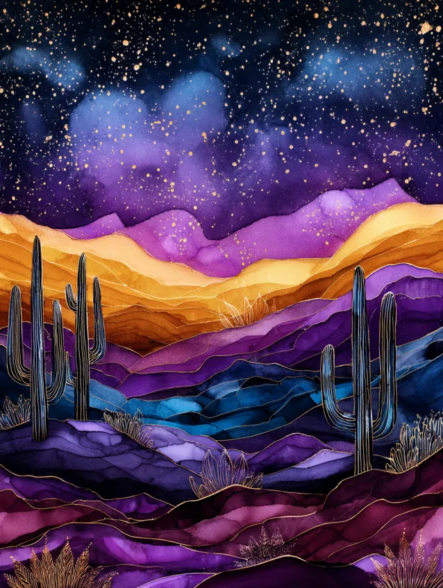 This metallic watercolor painting presents a vibrant desert scene layered with purple mountains, warm orange horizons, and tall silhouetted cacti. Metallic gold accents trace along the mountain ridges and highlight the glow of the setting sun. The sky transitions from rich violet into warm amber, creating a striking contrast that fills the canvas with depth.