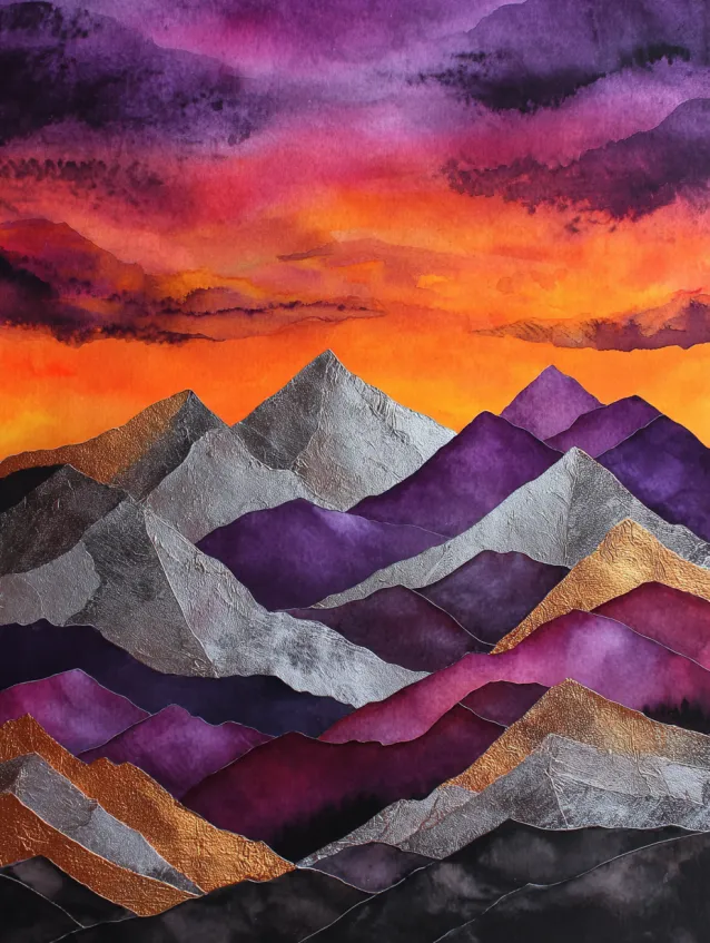 This metallic watercolor painting features dramatic mountain peaks stacked in layers of plum, charcoal, and deep rose beneath a fiery orange and magenta sky. Metallic highlights shimmer subtly along the ridgelines, adding texture and contrast to the darker shadows. The composition pulls the eye from the glowing horizon up through the cool toned mountains in a beautiful gradient flow.
