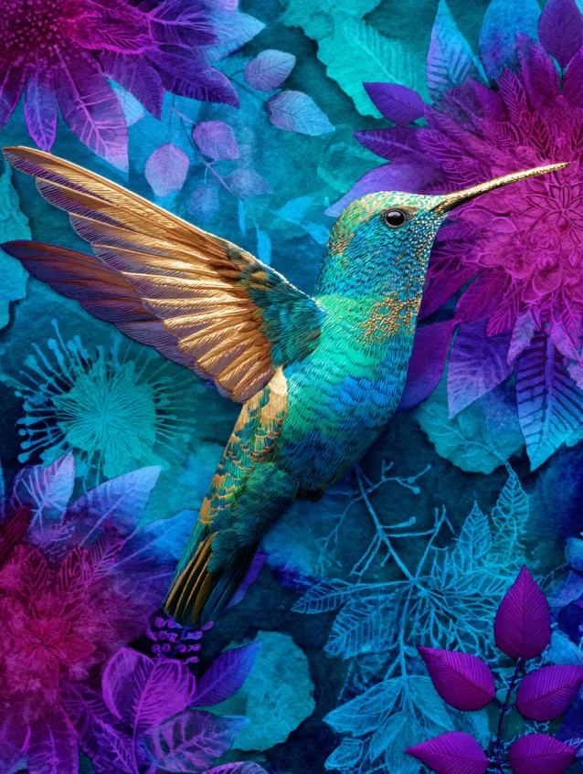 This metallic watercolor painting captures a hummingbird mid flight, surrounded by lush leaves in vibrant teal, fuchsia, and deep blue. The wings are brushed with soft metallic gold that glimmers against the jewel toned body. Overlapping foliage in the background creates a rich, layered frame that enhances the sense of movement.