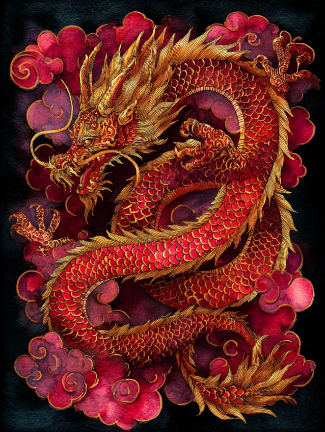 This metallic watercolor painting showcases a coiled red dragon surrounded by soft swirling clouds. The scales are detailed with shimmering gold accents that add texture and dimension against the rich crimson body. Deep shadowed tones in the background push the dragon forward, creating a layered, almost three dimensional effect that feels intense and powerful.