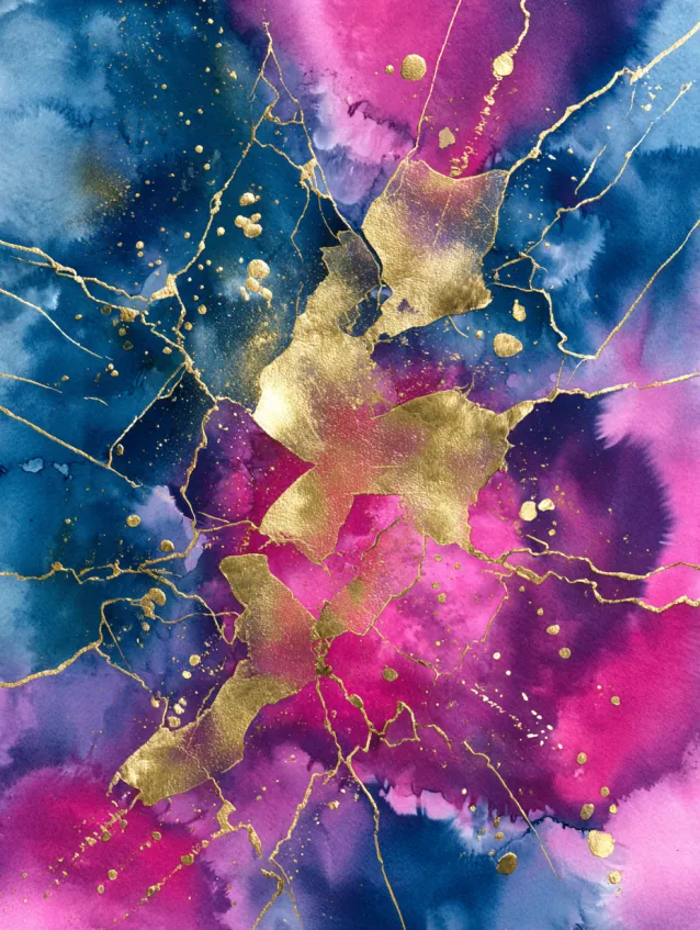 This bold metallic watercolor piece features an abstract blend of hot pink, royal blue, and deep violet, fractured by flowing veins of metallic gold. The gold lines cut through the organic color blooms like cracks in polished stone, creating strong contrast and a dramatic focal point. Soft gradients melt into one another, giving the painting a layered and dynamic feel.
