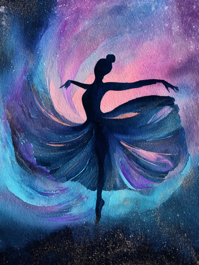 This metallic watercolor painting shows a graceful ballerina silhouette swirling in a galaxy inspired background of purples, blues, and soft pinks. Subtle metallic highlights shimmer through the flowing skirt and faint star speckles scattered across the sky. The circular motion of the composition pulls the eye inward, making the dancer feel suspended in a dreamy cosmic whirl.