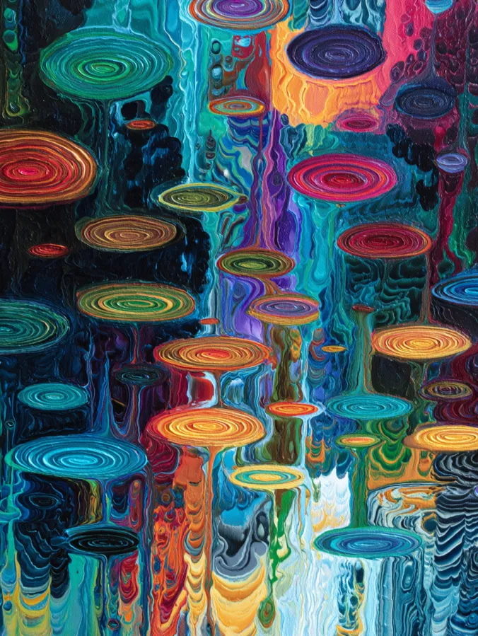 This abstract canvas feels like a dreamy world filled with glowing floating pools of color. Dozens of circular forms hover across the painting like little islands suspended in a vibrant liquid landscape. Each circle holds tight swirling rings of color in shades of turquoise, coral, golden yellow, lime green, violet, and deep crimson. Many of them appear to drip downward into fluid streams of paint that stretch toward the bottom of the canvas. The background flows with layered marbled textures and shifting color currents which makes the entire scene feel alive and slightly surreal.