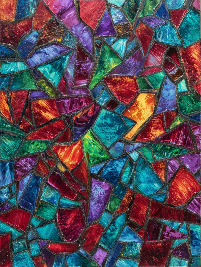 This abstract canvas looks like a vibrant mosaic made from colorful glass fragments. Irregular shapes in ruby red, emerald green, turquoise, sapphire blue, and rich violet fit together across the surface like a lively puzzle. Dark textured outlines separate each piece which makes the colors pop even more. The paint inside every shape carries visible brush strokes that catch the light and create a glossy jewel like effect. The whole composition feels busy in the best way with color and texture filling every corner of the canvas.