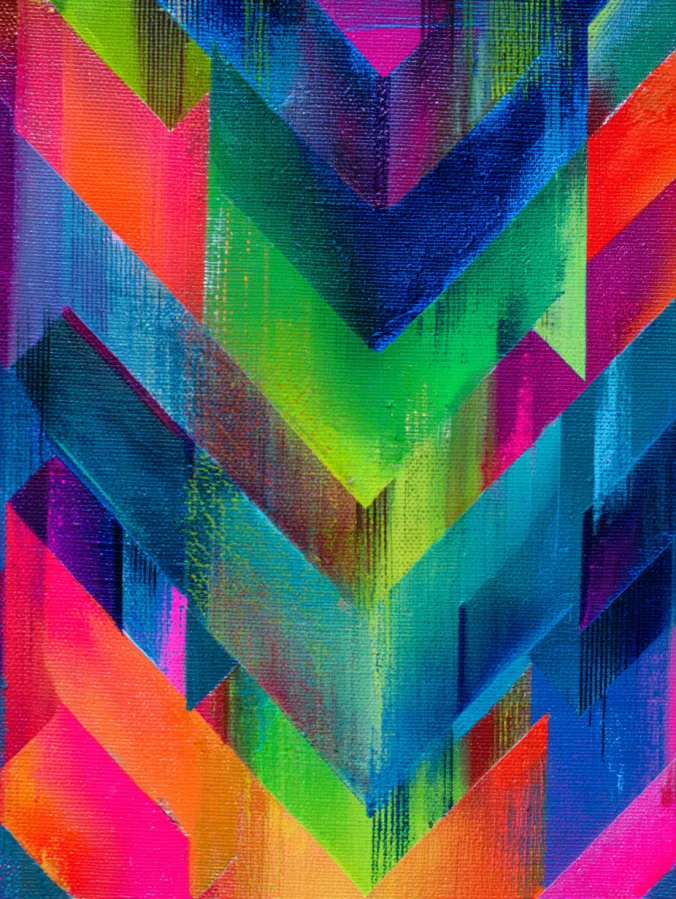 This abstract canvas features a bold stack of chevron shaped layers that point downward in a striking geometric pattern. Each band is filled with vivid color including electric blue, neon green, hot pink, bright orange, and deep violet. The shapes overlap slightly which creates a sense of depth while soft paint textures and subtle drips add an expressive touch. The angled lines guide the eye straight through the center of the painting which makes the whole composition feel energetic and modern. The contrast between the crisp shapes and the painterly brush strokes keeps the design lively and full of movement.