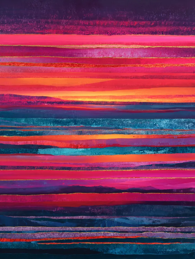 This abstract canvas is built from a series of horizontal bands that stretch across the entire composition like colorful horizons. Layers of hot pink, coral, crimson, deep plum, teal, and midnight blue stack on top of each other in uneven painterly stripes. Some bands appear soft and blended while others carry rough textured edges and subtle flecks of gold that shimmer between the colors. The variation in thickness gives the painting a rhythmic flow that moves the eye gently from top to bottom. The overall effect feels rich and atmospheric, almost like watching a glowing sunset reflected across distant water.