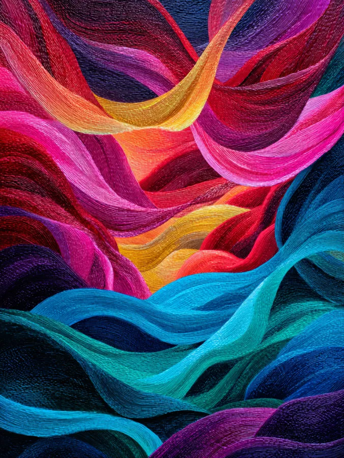 This abstract canvas is filled with graceful ribbons of color that weave and flow across the entire composition. Layers of rich magenta, deep crimson, warm coral, golden yellow, turquoise, and midnight blue curve over and under one another like soft waves. The brush strokes follow each curve which gives the painting a silky sense of movement. The colors shift gradually along the ribbons which creates beautiful transitions between warm and cool tones. The overall layout feels dynamic yet balanced with the flowing shapes guiding the eye naturally through the scene.