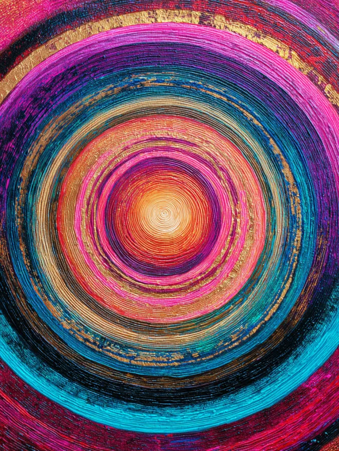 This abstract canvas centers around a glowing circular core that slowly expands outward through rich layers of color. Rings of warm coral, bright pink, golden amber, deep teal, and vibrant violet ripple across the surface like colorful echoes. Each circle carries textured brush strokes that feel slightly imperfect and wonderfully organic. Thin lines of metallic gold peek through the layers and add a luminous shimmer that catches the eye. The composition feels balanced and hypnotic. The eye naturally travels from the glowing center outward through the vibrant rings that fill the entire canvas with motion and color.