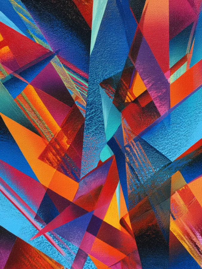 This abstract canvas feels like a burst of colorful glass shards frozen mid motion. Sharp triangles and angular shapes overlap and intersect across the entire composition, creating a layered mosaic of bold color. Electric blues collide with fiery orange, rich crimson, deep violet, and bright turquoise. Each shape appears to slice through another which creates depth and movement across the canvas. The brushwork carries a slightly textured finish that gives the surfaces a soft grain while the crisp edges of the shapes keep the design feeling modern and energetic.