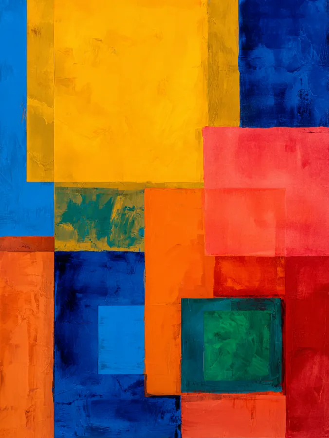 This abstract canvas plays with bold rectangular shapes that stack and overlap like a lively patchwork of color. Large blocks of sunshine yellow, bright coral, deep cobalt blue, and warm orange create a striking grid that fills the entire composition. Smaller squares in teal and soft blue add extra layers and visual rhythm. The brush strokes are soft and slightly textured which gives each block a hand painted feel rather than perfectly flat color. Some shapes appear slightly transparent where they overlap which adds depth and a relaxed modern vibe to the layout.