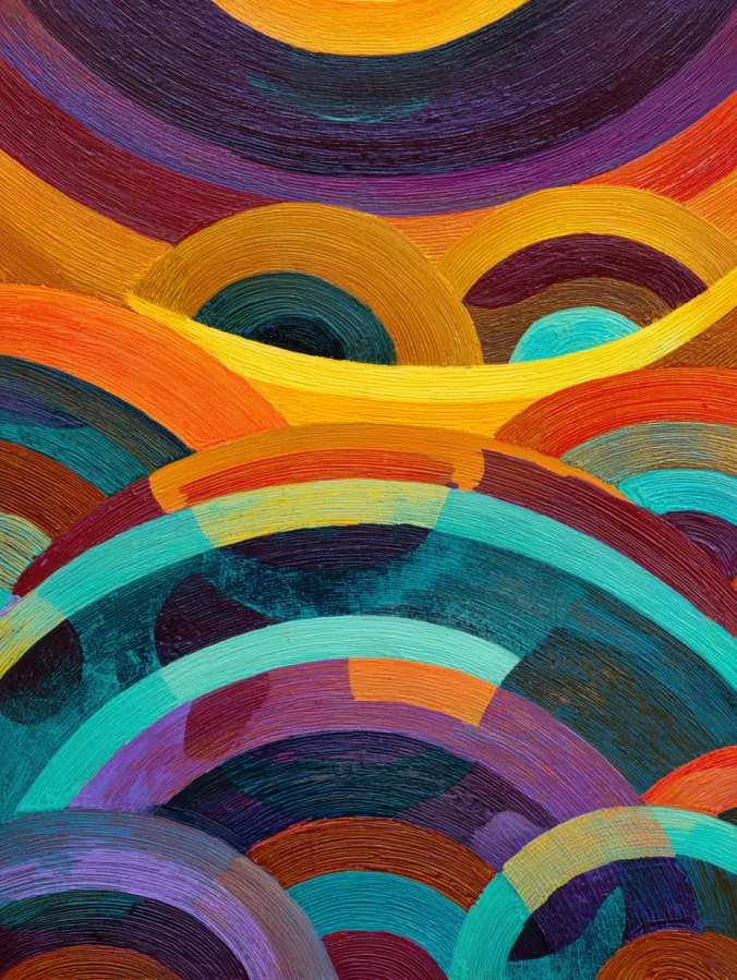 This abstract canvas is packed with colorful arches and curved shapes that interlock like a playful architectural puzzle. Bold strokes of burnt orange, golden yellow, deep plum, turquoise, teal, and rich crimson sweep across the canvas in repeating curved forms. Some arches stretch tall while others tuck neatly underneath larger shapes which creates a layered mosaic effect. The brush strokes follow the curves which adds a smooth sense of flow through the design. Each section feels connected yet distinct, filling the whole canvas with vibrant color and rhythmic movement.