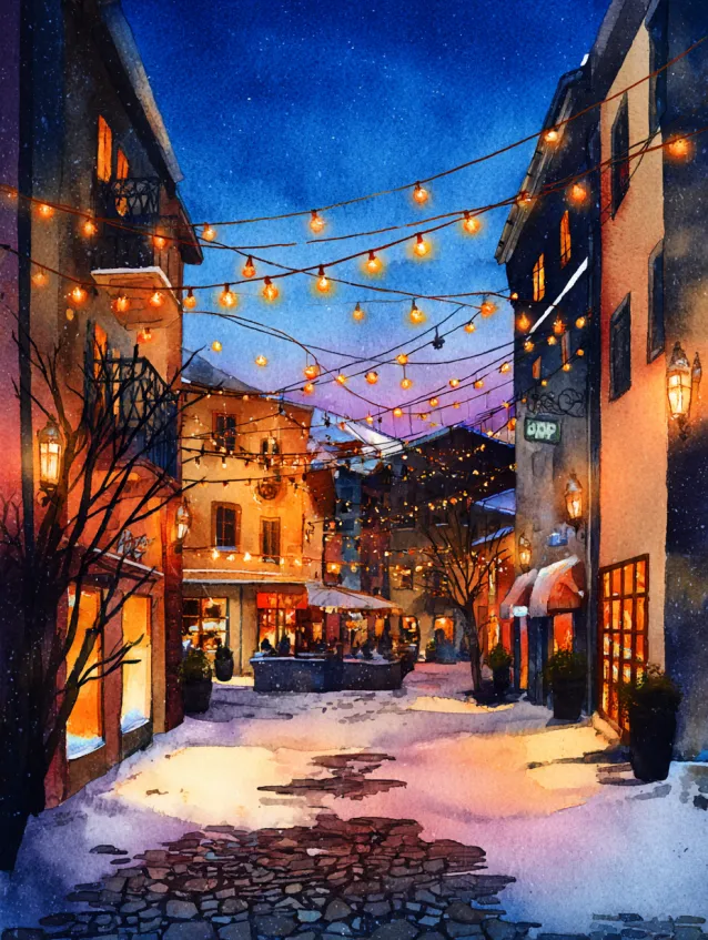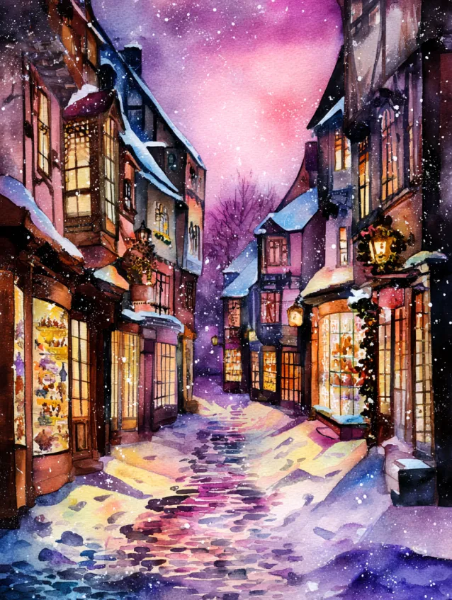 This watercolor scene captures a charming snowy alleyway lined with glowing shop windows and strands of warm fairy lights draped overhead. The buildings rise on either side in rich navy and midnight blue tones, while golden light spills onto the snow covered street below. Tiny figures gather in the distance, adding life and depth, and the sky above fades from soft pink to deep indigo. The composition naturally pulls your eye inward, with reflections shimmering across the textured snow.