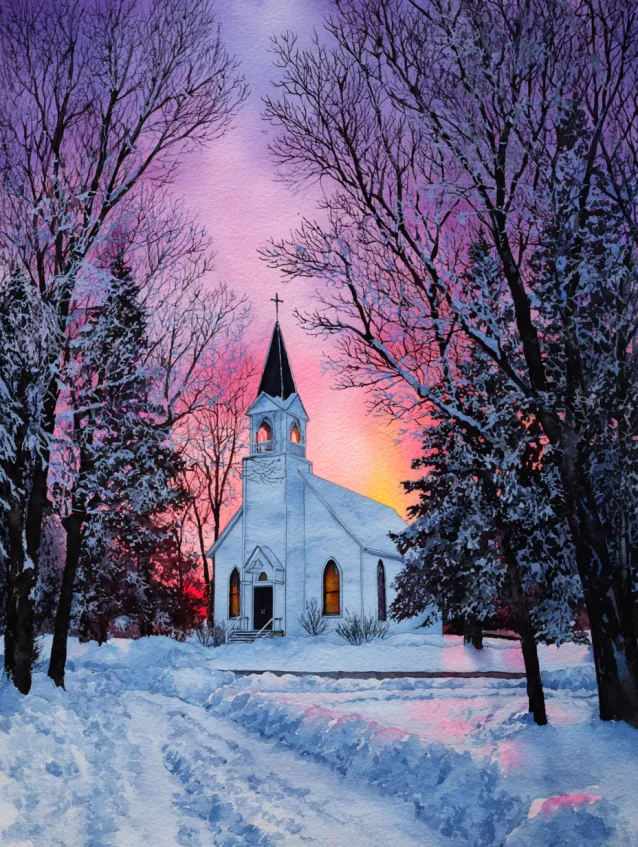 This winter watercolor design shows a small white church nestled between tall bare trees, with a soft pink and orange dusk sky glowing behind it. Snow covered paths lead gently toward the building, and warm light glows faintly from the windows. The tall dark trees create a natural frame, adding depth and drama to the composition. The cool blues of the snow contrast beautifully with the warm sky above.
