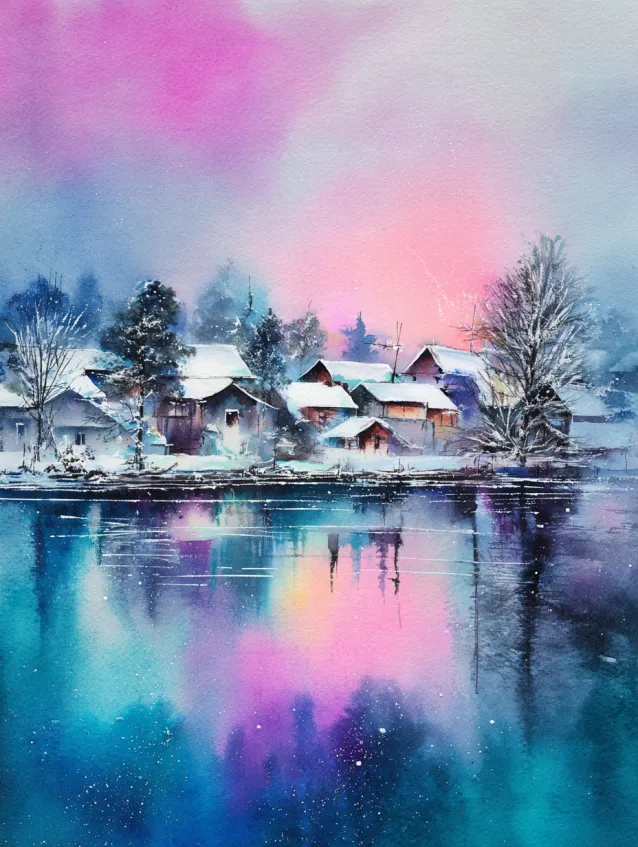 This watercolor painting captures a snowy lakeside village reflected in still icy water. The sky glows in dreamy shades of pink, teal, and lavender, mirrored perfectly below. Small houses line the shoreline, their rooftops dusted with snow and their windows softly illuminated. The reflection creates stunning symmetry and depth across the composition.