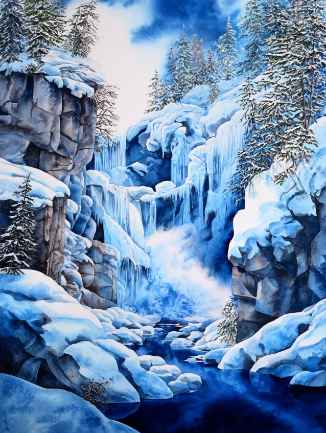 This dramatic winter watercolor scene showcases a cascading waterfall partially frozen in ice, surrounded by towering snow covered cliffs and pine trees. Cool blues and icy whites dominate the palette, while subtle highlights add sparkle to the frozen textures. The layered rocks and flowing water create beautiful movement and depth within the vertical composition.
