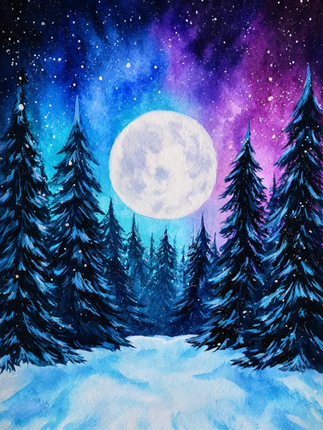 This winter watercolor design features a glowing full moon suspended in a galaxy filled sky of purples, teals, and deep blues. Tall evergreen trees frame the scene, their snow dusted branches reaching toward the luminous sky. A soft snowy path winds gently through the forest, leading the eye toward the moonlit horizon. The layered trees and glowing moon create beautiful contrast and depth.
