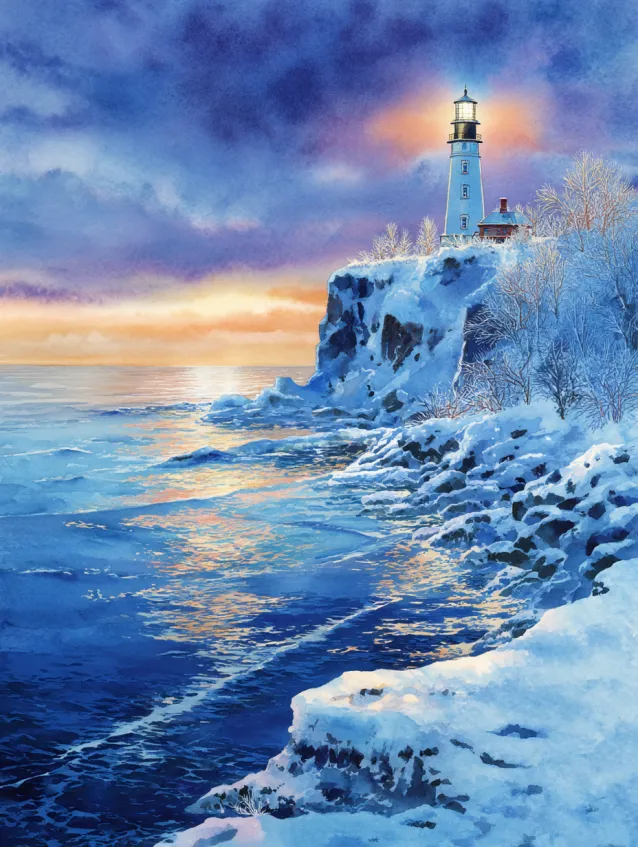 This watercolor painting shows a lighthouse perched on icy cliffs overlooking a calm winter sea. The sky glows with warm peach and lavender tones, while the ocean reflects soft gold and cool blue hues. Snow clings to the rocky shoreline, creating texture and movement in the foreground. The lighthouse stands tall and bright, anchoring the composition with quiet strength.