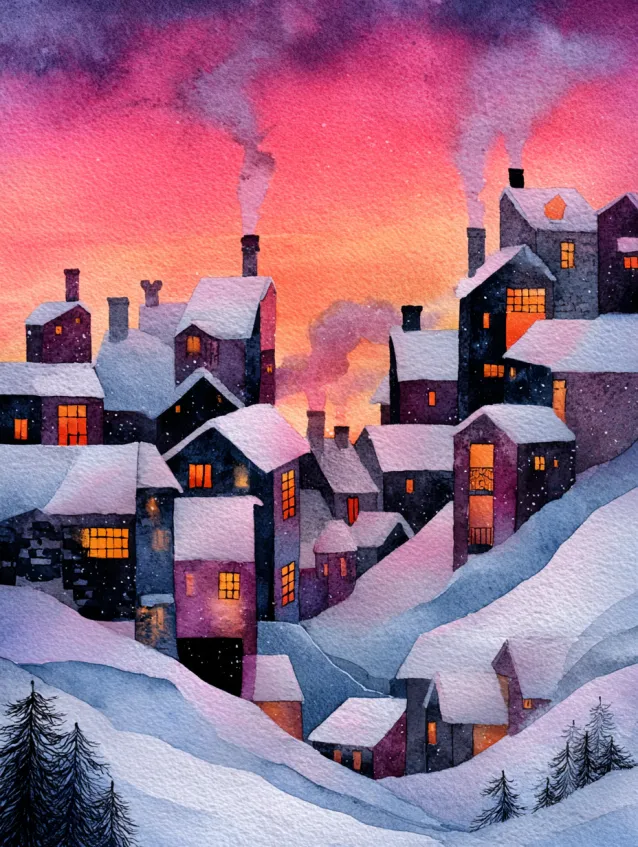 This watercolor scene captures a cluster of snow covered cottages nestled along a gentle hillside under a radiant pink and coral sky. Warm light glows from the windows, and thin trails of chimney smoke curl upward into the sunset. The rooftops layer beautifully across the composition, creating depth and rhythm against the cool snowy slopes.