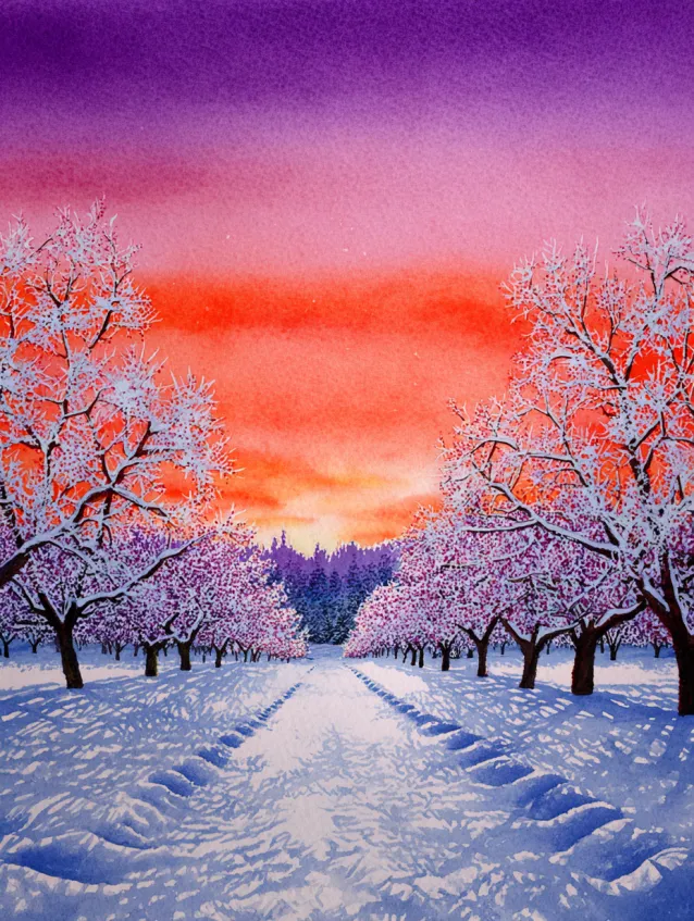 This winter watercolor painting features a quiet country road lined with frost covered trees, their delicate branches sparkling under a vibrant orange and magenta sky. The snow along the path is painted in soft lavender and blue shadows, creating dimension and softness. The perspective draws the viewer straight down the glowing path toward the horizon.