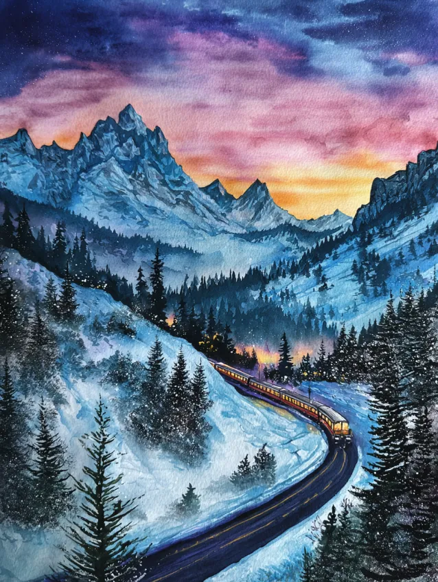 This dramatic watercolor scene showcases towering mountain peaks under a richly colored sunset sky of pink, purple, and gold. A winding road cuts through the snowy valley, its subtle headlights adding a soft glow against the cool blues of the landscape. Evergreen trees frame the lower edges, giving the composition balance and depth.