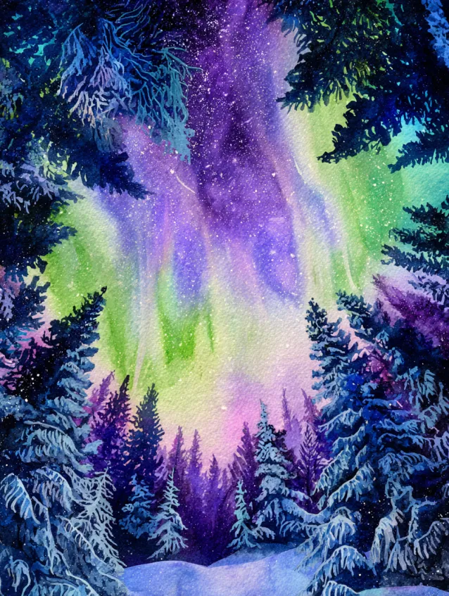 This watercolor design bursts with vivid green and violet aurora lights dancing high above a forest of snow covered evergreens. The sky feels alive with motion, while the trees below are painted in deep cool blues with crisp white highlights. The vertical composition draws your gaze upward, emphasizing the luminous ribbons of color.